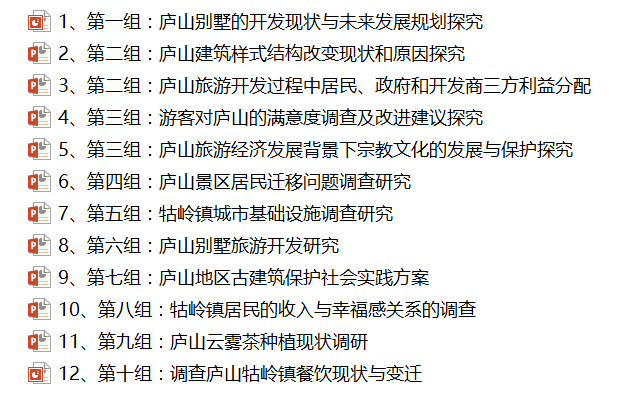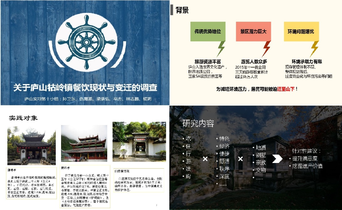 第二、三、六组同学关注了庐山地区的旅游情况。第二组的第二个提案聚焦庐山旅游开发过程中居民、政府和开发商三方利益分配问题,通过为什么庐山上会允许兴建别墅进行销售及谁给了开发商批文的发问展开调研,并期望通过调研了解庐山旅游开发过程中居民、政府和开发商三方利益分配情况,并对不合理的地方进行调整;第六组同学发现庐山别墅旅游开发的现状问题,如庐山传统旅游线路未与别墅群资源合理结合、庐山别墅资源开发缺乏统一规划、庐山别墅群保护缺乏相关法律法规等方面,希望通过调研找到合适的方法来改进现状。