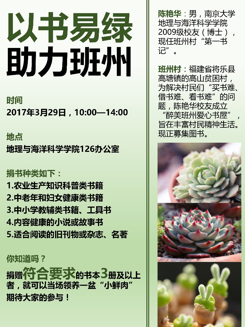 从3月29日的上午10时至下午14时,昆山楼126办公室人来人往,老师们、同学们或提着袋子,或托着箱子,袋中和箱中装着的都是一摞摞图书。有些同学想捐的书太多,一次性没法全部送下楼,于是就一趟又一趟地抱着书来到126办公室,每次都带来的都是一本本自己珍藏已久的书籍。按照规则,捐赠符合要求3本书及以上者,可以置换一盆“多肉”植物,活动结束时,50盆“多肉”植物均找到了自己的主人。