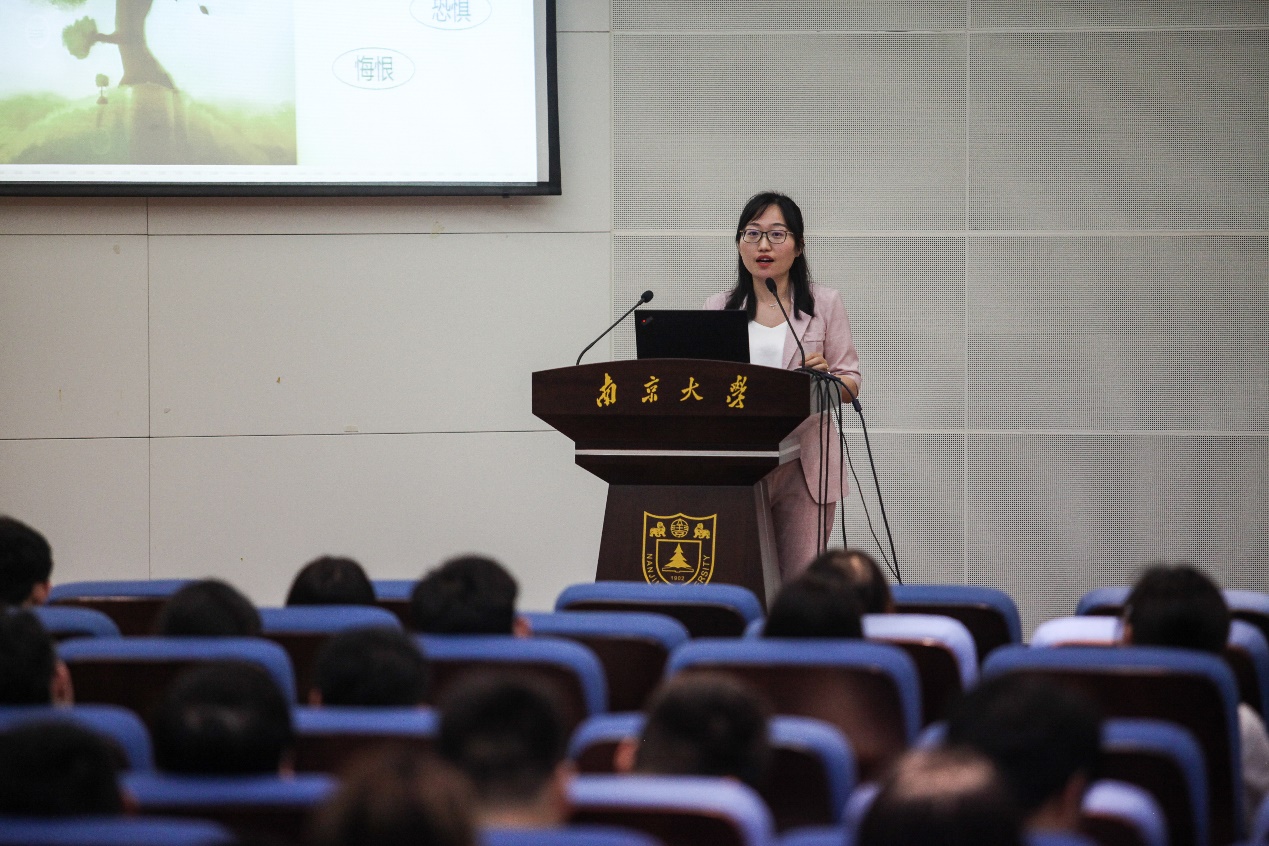 陈卉重点讲述了青年党员应该树立什么样的择业观,她邀请在场同学共同重温入党誓词,逐词逐句对誓词进行剖析,提炼出对青年党员工作态度、工作宗旨、工作时长和工作代价的要求。随后,集中展示了马克思、习近平总书记有关青年人择业观的经典语录,播放了南京大学韦慧晓校友的事迹视频片段、纪念两弹一星元勋邓稼先的情景剧《等待》片段。最后,她寄语全体青年党员不忘初心,牢记使命,志存高远,收获出彩人生。