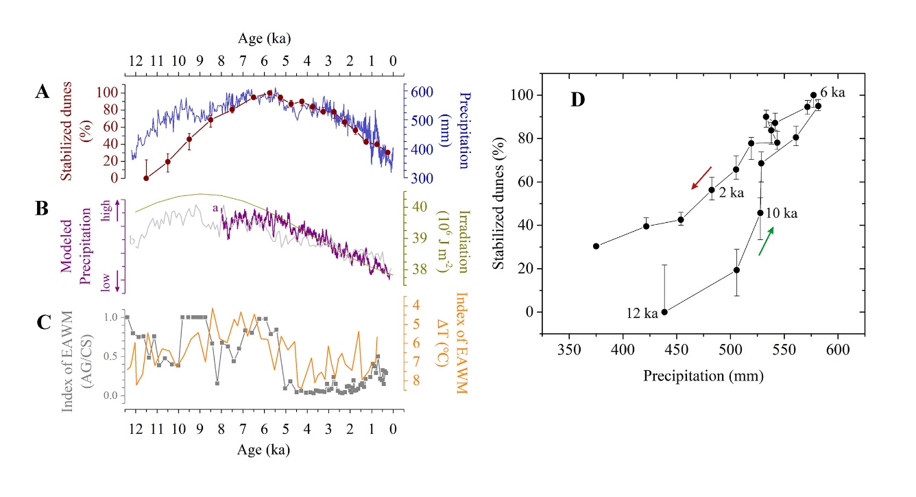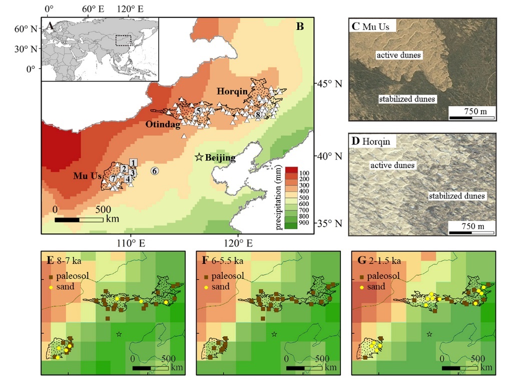 围绕干旱区环境变化,我校线上足球现金网 鹿化煜教授的研究团队在我国北方沙漠沙地开展了二十年的研究工作。近年来,在科技部重点研发计划和国家自然科学基金等项目的支持下,他们对多个沙漠沙地开展了“拉网式”考察和大量样品采集、测试分析,构建了近百个有精确年代控制的风沙沉积记录,取得了一系列科研成果。2016年起,该团队徐志伟博士等与我校生科院徐驰教授团队协同美国、荷兰、以色列以及国内多个高校的学者组成的多学科联合团队,针对我国北方半干旱地区的主要沙地(包括毛乌素沙地、浑善达克沙地和科尔沁沙地等)144处风沙沉积进行了基于过程分析的点位特异性重建与集成,利用500多个地层-独立年代数据和古气候重建-模拟资料,获得了这些沙地过去一万两千年的环境变化历史(分辨率达到五百到一千年)。研究发现,我国北方沙地在过去一万两千年以来就存在与现今类似的流动沙丘与固定沙丘共存的现象,并且在距今六千年前后流动沙丘面积最少。受到季风降水变化的影响,在局部沙丘状态(流动或固定)的变化在较短时间内发生,表现出明显的突变特征,但突变发生的时间节点具有显著的不同步特征,其演化轨迹也具有鲜明的空间异质性。沙丘双稳态格局的形成及状态突变主要与植被、土壤与风沙活动之间的多种正反馈作用有关,并且受到生态系统内部过程的调节。在全域尺度上的重建结果表明,由于局部空间异质性特征相互抵消,这些沙地的总体状态演化表现为渐变特征,并且与季风降水存在较为明确的定量关系(但仍然存在迟滞现象)。这一研究成果有助于理解目前我国北方沙漠沙地环境变化机理以及预测区域环境变化趋势。这项研究凸显出考虑空间尺度和地表圈层相互作用在干旱区地貌发育和环境变化研究中的重要性,同时为澄清撒哈拉沙漠等全球其它干旱区环境突变和渐变的历史过程和机制提供了重要参考。