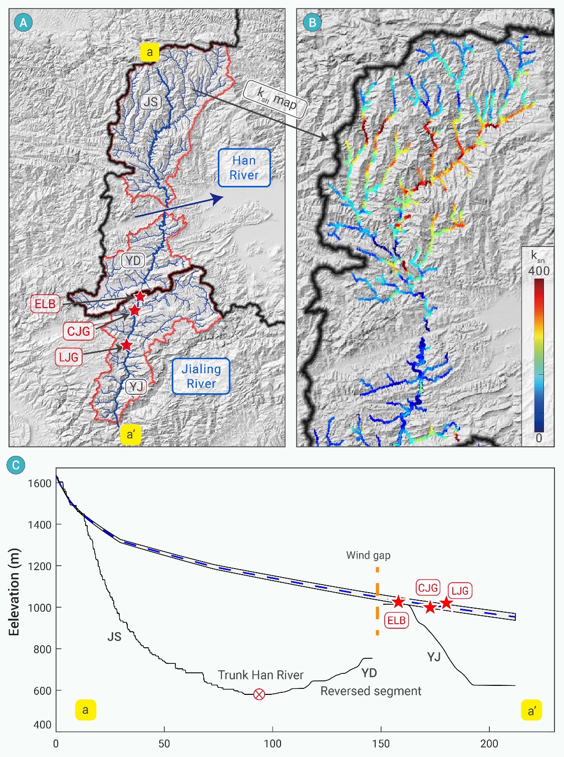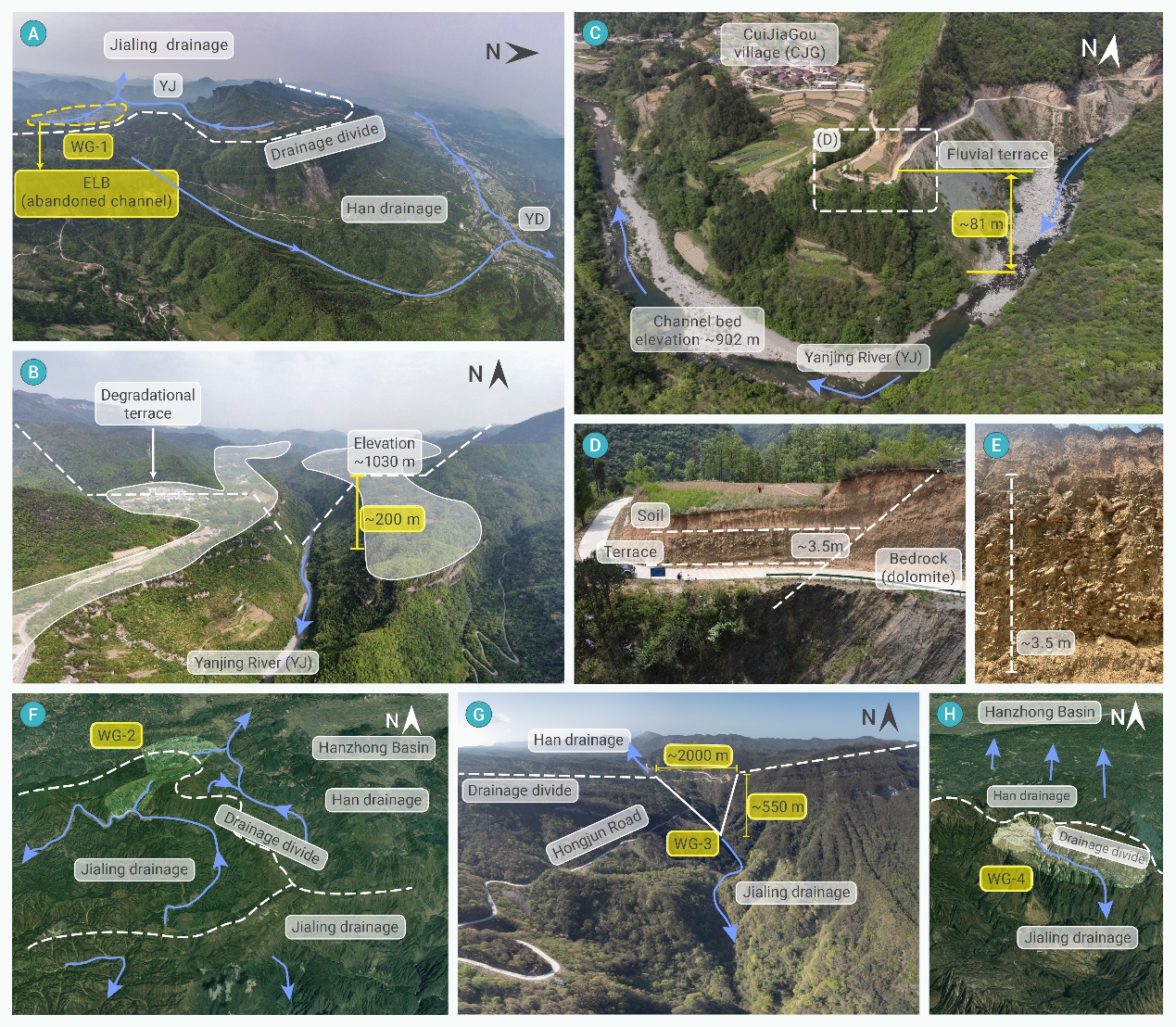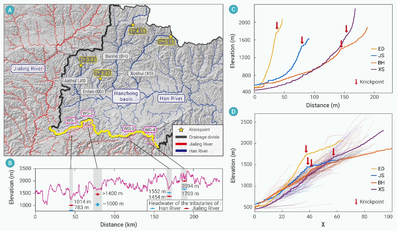 为了探索这一问题,南京大学王先彦教授团队采用了一系列科学方法进行深入研究。首先,通过分析河流纵剖面数据,在汉江北侧支流中发现多个河流裂点(图3),且裂点的形成年代显示出由东向西逐渐变年轻的趋势,暗示了一个自东向西逐步推进的袭夺过程(图3)。进一步,基于基岩河道侵蚀模型重建了沮水河(JS)裂点下游方向的古河道剖面,这条古河道剖面与嘉陵江流域内发现的风口(WG-1)及河流阶地(CJG、LJG)相吻合,表明曾发育有南流河流的存在,后来被袭夺、转向南流(图4&5)。根据基岩河道侵蚀模型计算出的河流裂点的形成时间,推断水系间的袭夺开始于晚中新世至上新世期间。