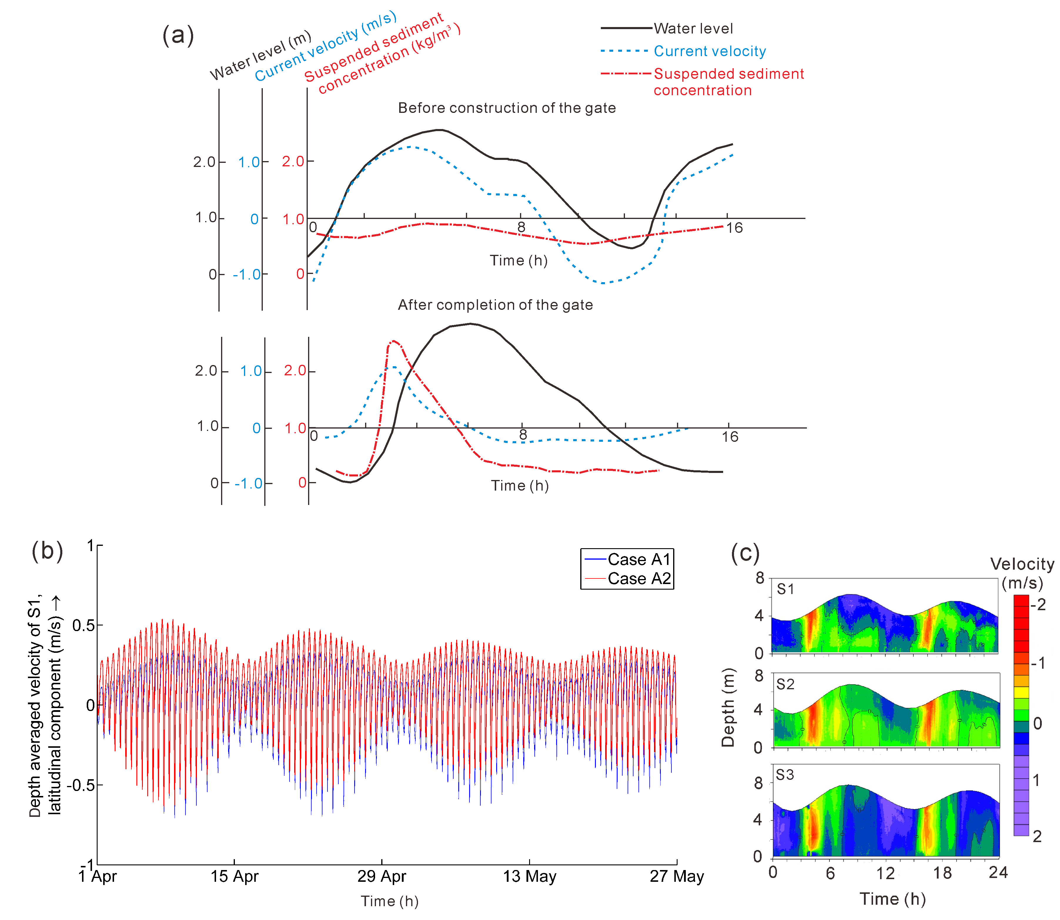 对于人类活动强烈干预的河口区域,通过构建合理的模拟方案进行过程模拟,并且与实测数据进行对比分析,可以有效地揭示河口地貌演化的动力机制,定量评估人类活动对地貌演化造成的影响。同时,这类强调过程与机制的数值模拟也可为挡潮闸的运行和管理提供有效建议,有助于解决建闸导致的淤积问题。该项成果发表于国际期刊:Qingguang Zhu, Ya Ping Wang, Shu Gao, Jicai Zhang, Mingliang Li, Yang Yang, Jianhua Gao, 2017. Modeling morphological change in anthropogenically controlled estuaries, Anthropocene, 17, 70-83. //dx.doi.org/10.1016/j.ancene.2017.03.001.