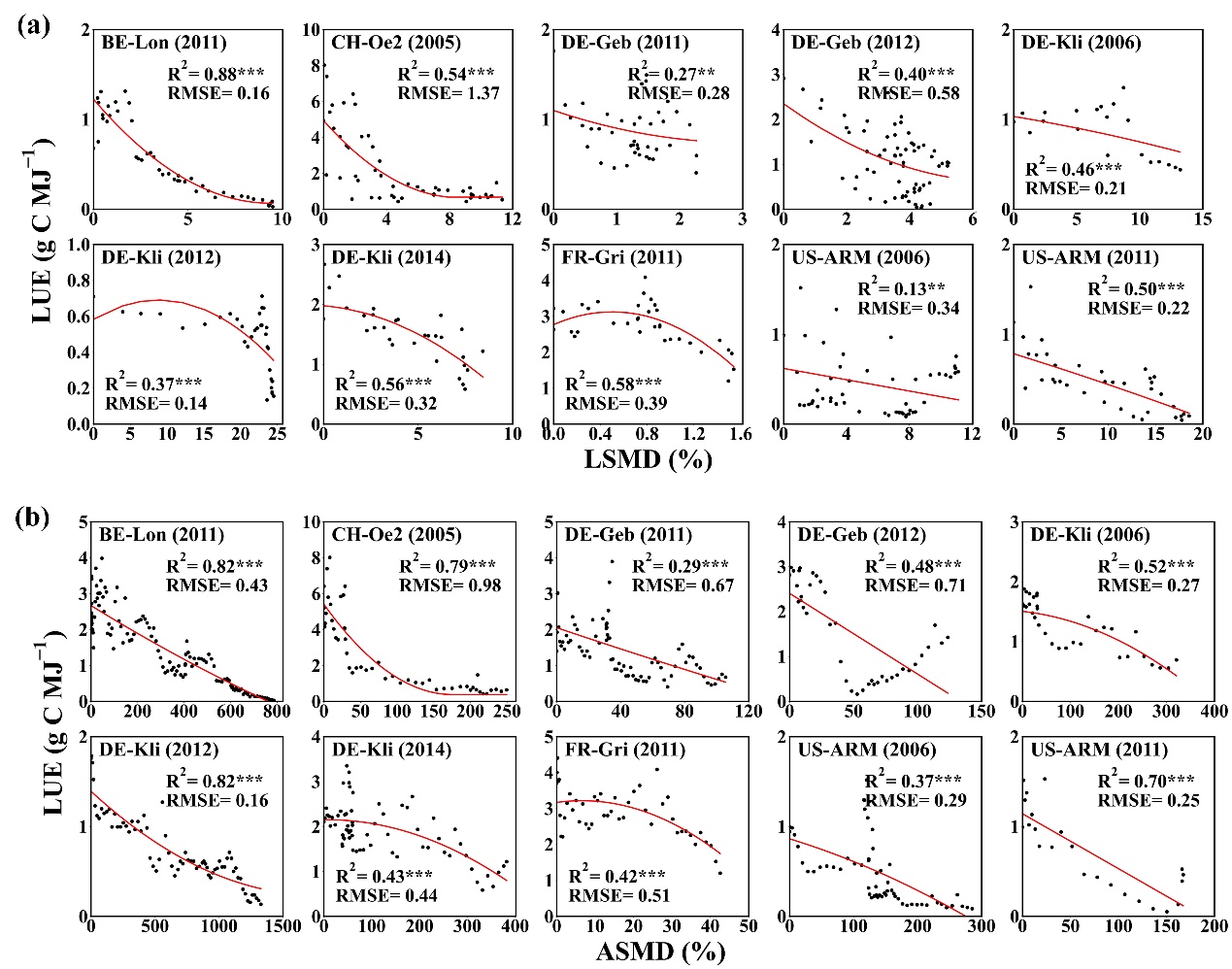 总初级生产力(GPP)是生物圈与大气之间最大的碳通量,LUE反映植被对光的利用效率,两者均受干旱或土壤水分亏缺的影响。近年来干旱发生的频率和程度均加深,因此,研究干旱或土壤水分亏缺对生态系统碳循环的影响具有非常重要的意义。森林和农田是陆地生态系统的重要组成部分,然而,土壤水分亏缺对森林和农田的滞后和累积影响仍不清楚。本研究基于35个通量观测站点数据,研究累积土壤水分亏缺(ASMD)、滞后土壤水分亏缺(LSMD)和瞬时土壤水分亏缺与GPP和LUE之间的关系。
