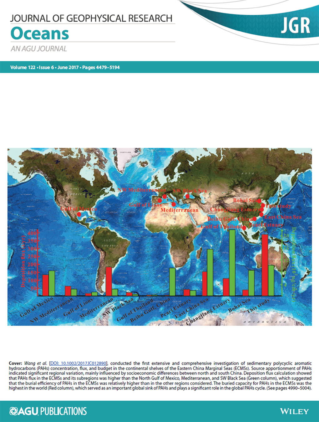 现金网-线上足球现金网 、海岸与海岛开发教育部重点实验室的邹欣庆教授课题组有关我国近海环境中多环芳烃(PAHs)环境行为方面的研究获得重要进展,相关成果以“Distribution pattern and mass budget of sedimentary polycyclic aromatic hydrocarbons in shelf areas of the Eastern China Marginal Seas”为题,以封面论文形式(图1)发表在著名地学综合性刊物《Journal of Geophysical Research: Oceans》上(J. Geophys. Res. Ocean. (2017).122, (6): 4990-5004.)。该论文的第一作者为现金网-线上足球现金网 2017级博士研究生王成龙,通讯作者为邹欣庆教授。