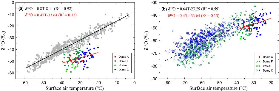 图2 南极内陆夏季降雪δ18O与温度的关系及其与表层雪(a)和冬季降雪(b)δ18O与温度关系的对比