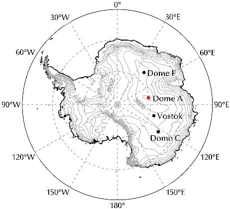 图1 南极冰盖Dome A、Vostok、Dome C及Dome F位置分布图