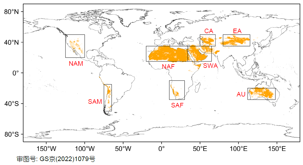 图1. 全球沙漠分布。橙色为沙漠覆盖区。图中英文缩写分别指示:中亚沙漠(CA)、东亚沙漠(EA)、西南亚沙漠(SWA)、北美沙漠(NAM)、南美沙漠(SAM)、北非沙漠(NAF)、南非沙漠(SAF)和澳大利亚沙漠(AU).
