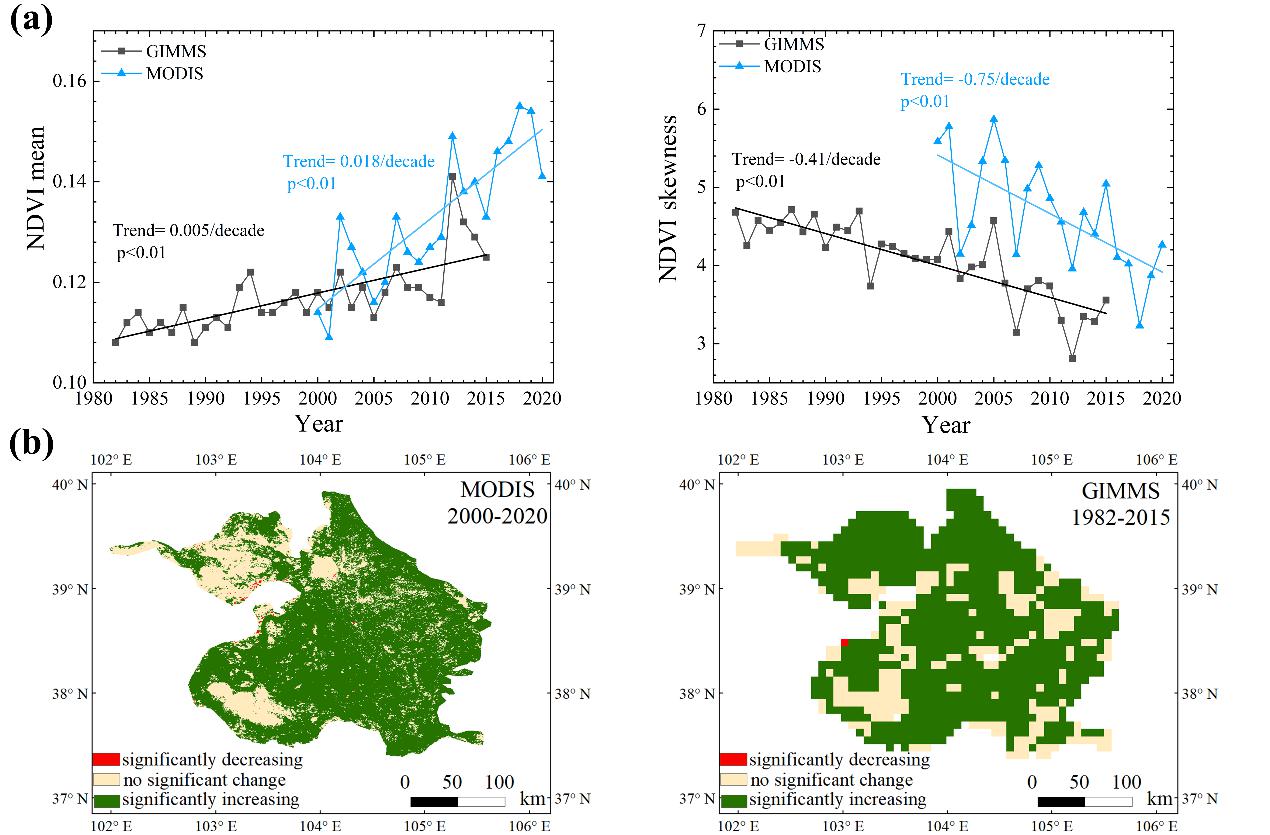 图2 (a)NDVI揭示的1982-2020年腾格里沙漠植被年际变化;(b)两种NDVI数据源揭示的腾格里沙漠植被变化特征