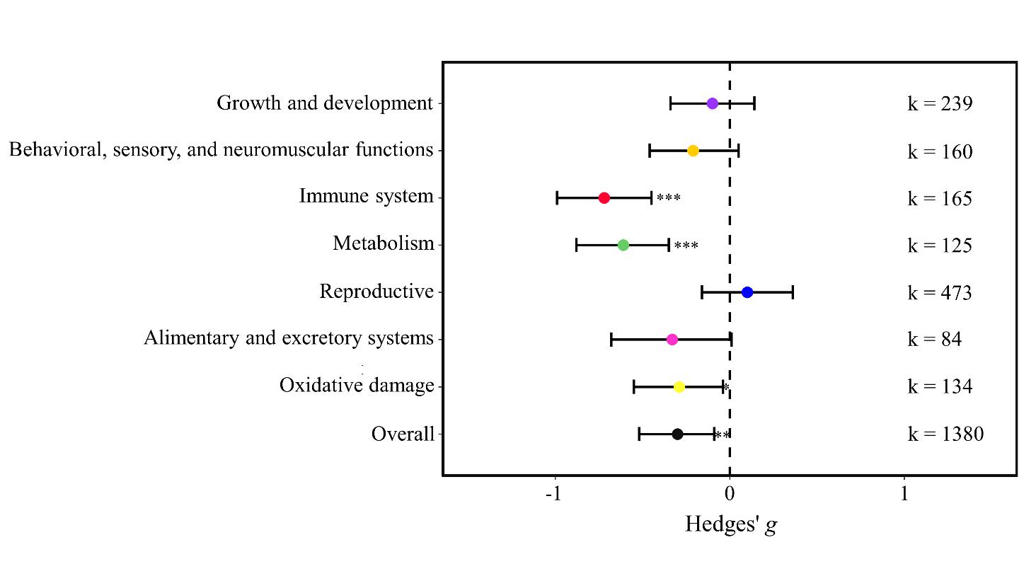 在此背景下,线上足球现金网 邹欣庆教授团队选择鱼类为目标研究对象,溶解态为污染物存在形式,进行了一项荟萃分析,定量总结全球文献中现有的实验证据,并使用效应大小估计器来确定毒性的变化(方向和大小)以及对生物功能和系统的影响。研究发现在环境MP浓度的背景下,共存污染物溶液中MP的存在显著增加了对鱼类的毒性,具体而言,MPs会增加对免疫系统、代谢和氧化损伤的负面影响,但对生长和发育、行为和感觉及神经肌肉功能、消化和排泄系统、繁殖没有显著影响(图2)。此外,通过亚组/元回归分析探讨可能影响毒性的因素,发现毒性的变化与鱼类的生长阶段和MP大小有关,但与共存污染物类型、MP类型、有机污染物的logKow、暴露时间无关(图3)。最后,从MPs、共存污染物、环境因素和实验对象四个方面讨论了实验室研究与实际水生环境的差异,这些差异可能会影响评估的准确性。本研究为从复合污染的角度进一步了解MPs对水生生物的潜在影响提供了基础。此外,鉴于污染是渔业资源减少的重要因素,本研究可以为水生生态系统的保护和管理提供参考。