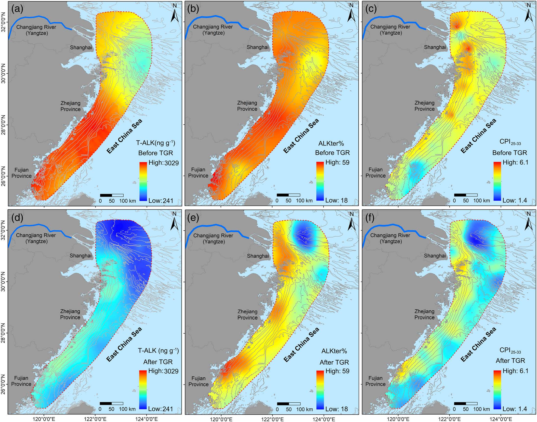 沉积有机质的研究结果显示,2018年研究区表层沉积物中TOC和n-alkanes含量相较于2006年显著降低(图2),河口外陆架区和浙-闽沿岸泥质区的下降幅度最为明显。C/N比值的结果显示,陆源有机质的相对含量有所下降,尤其是在河口区的下降趋势明显,但δ13C的变化特征并不一致。ALKter%(C27,C29,C31n-alkane占n-alkanes总量的相对比例)的研究结果显示,2018年长江河口-陆架区表层沉积物的ALKter%相较于2006年表现出明显的下降趋势。此外,2018年研究区表层沉积物的CPI25-33指数相较于2006年也表现出较为明显的下降趋势。由以上多个指标的研究结果发现,研究区表层沉积物中陆源有机质的相对比例呈下降趋势,而流域工程建设导致的陆源颗粒有机质输入通量减少可能是导致这一现象的关键影响因素之一。