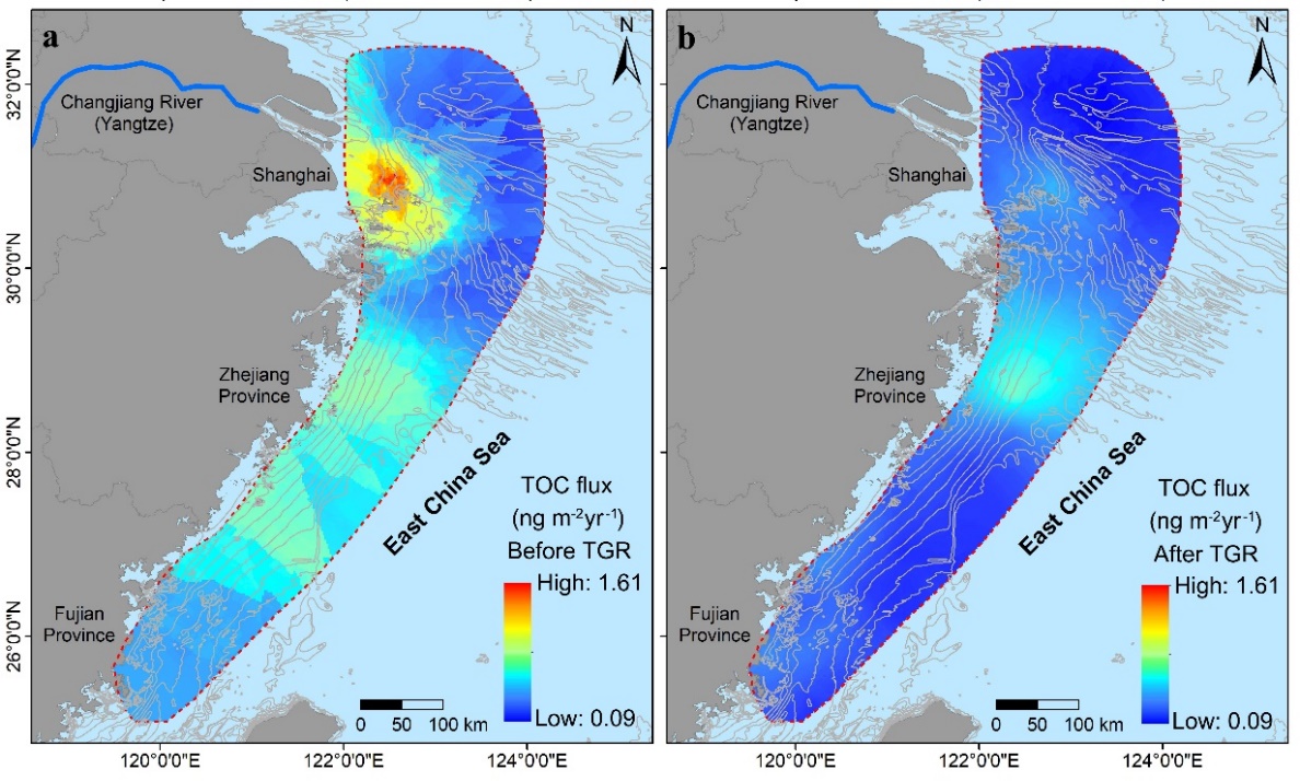 我国东海属于典型的受大河影响的陆架边缘海,长江每年向其输送大量颗粒有机质。巨量陆源物质入海后在长江河口-陆架区形成典型的泥质沉积体,为颗粒有机质提供了良好的埋藏场所。随着流域工程活动不断加剧,长江入海泥沙通量显著减少,并导致长江河口-陆架区的底床沉积物发生再分配,从而可能影响颗粒有机质的输运和沉积过程。线上足球现金网 邹欣庆教授团队,围绕这一问题,开展了全面深入的研究,取得了一系列新进展。近期,他们在国外重要学术刊物Geophysical Research Letters, Water Research, Journal of Geophysical Research: Oceans等发表多篇论文,论证流域工程影响下长江河口-陆架区沉积有机质的时空分布变化及其响应机制。