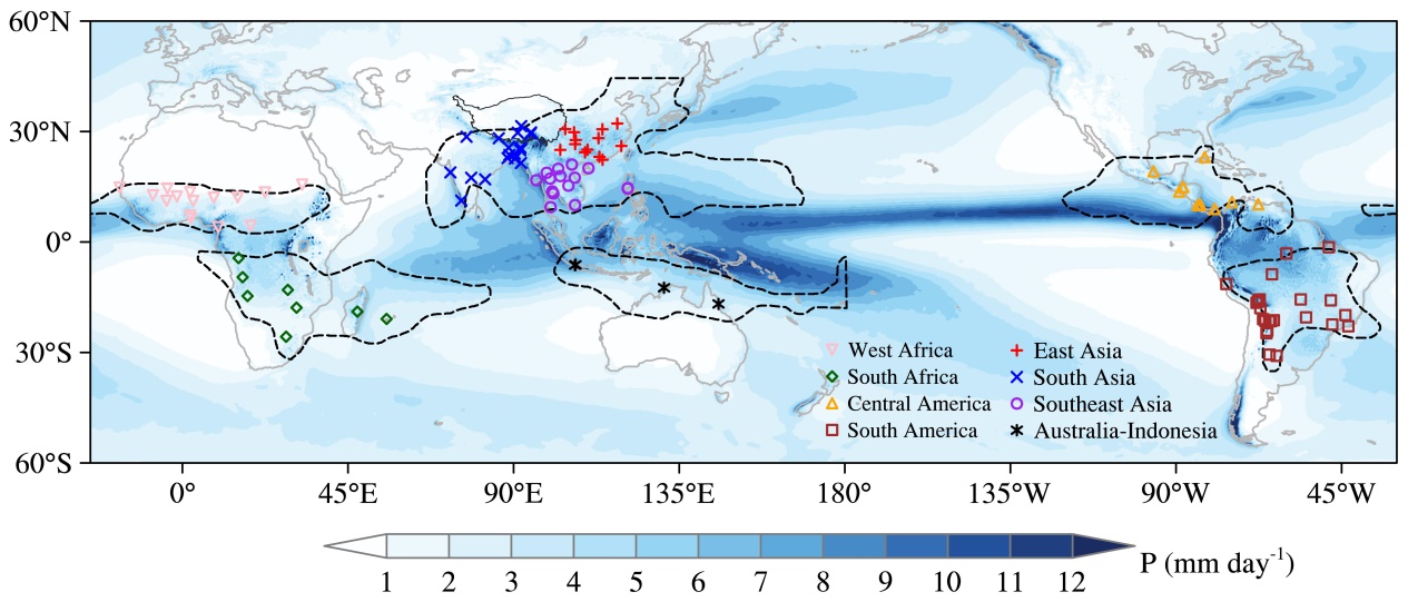 图1:全球季风区降水同位素观测站点分布。黑色点线为每个季风区的边界,阴影为年平均降水量。