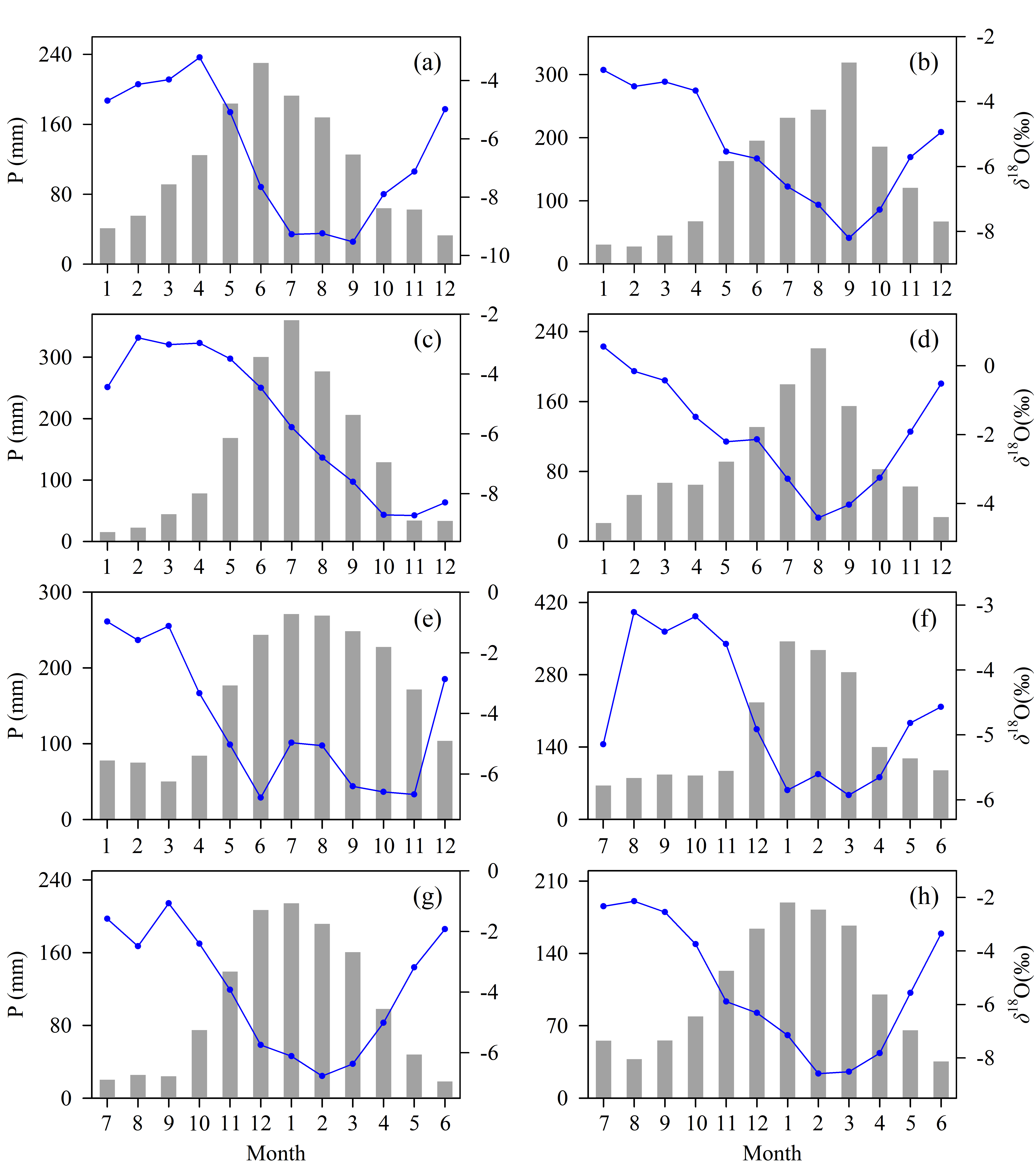 图2:全球各季风区平均降水同位素值(δ18Op)和降水量的季节变化。东亚季风区(a)、东南亚季风区(b)、南亚季风区(c)、西非季风区(d)、中美洲季风区(e)、澳大利亚-印度尼西亚季风区(f)、南非季风区(g)和南美季风区(h)。蓝色折线代表δ18Op值,灰色柱状代表降水量。