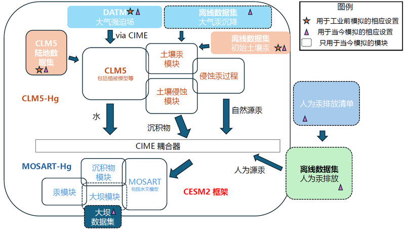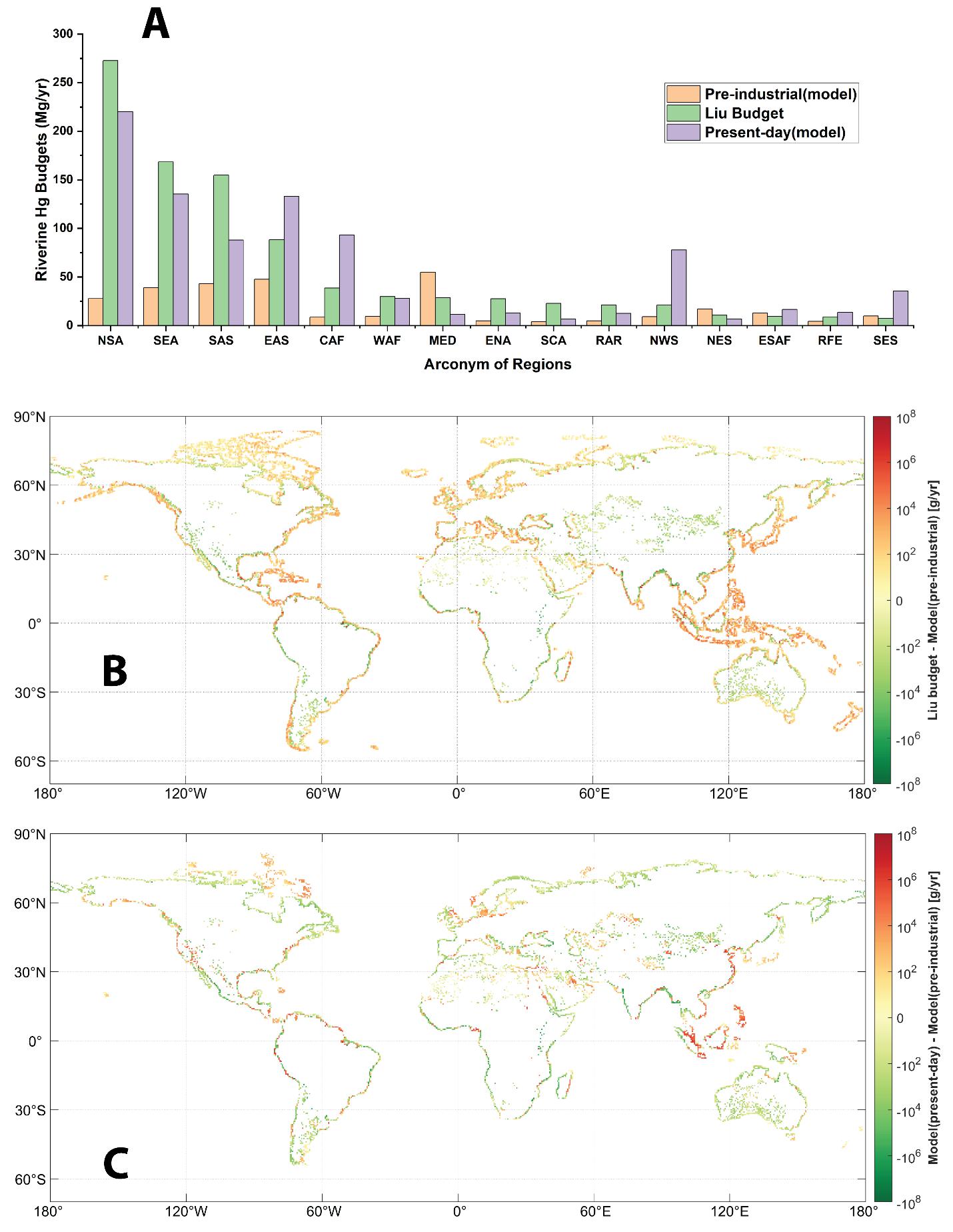 汞化合物是一类强效的神经毒素,主要通过食用鱼类威胁人类健康。河流不仅是饮用水和食物的重要来源,自工业革命(约1850年)以来,其汞浓度和向沿海地区的输出量也显著上升。然而,这一变化的时空格局尚未被系统研究,限制了对相关环境政策成效的评估。近日,现金网-线上足球现金网 与大气科学现金网 联合课题组于国际刊物Science Advances发表题为“Human perturbations to mercury in global rivers”的研究论文。该文基于地球系统模式CESM2与E3SM开发全球河流汞模型,采用工业前时期气象驱动场来模拟工业前时期的河流总汞通量,并通过与现代观测估算和模拟进行深入对比,系统量化了近现代人类活动对河流汞循环的扰动。