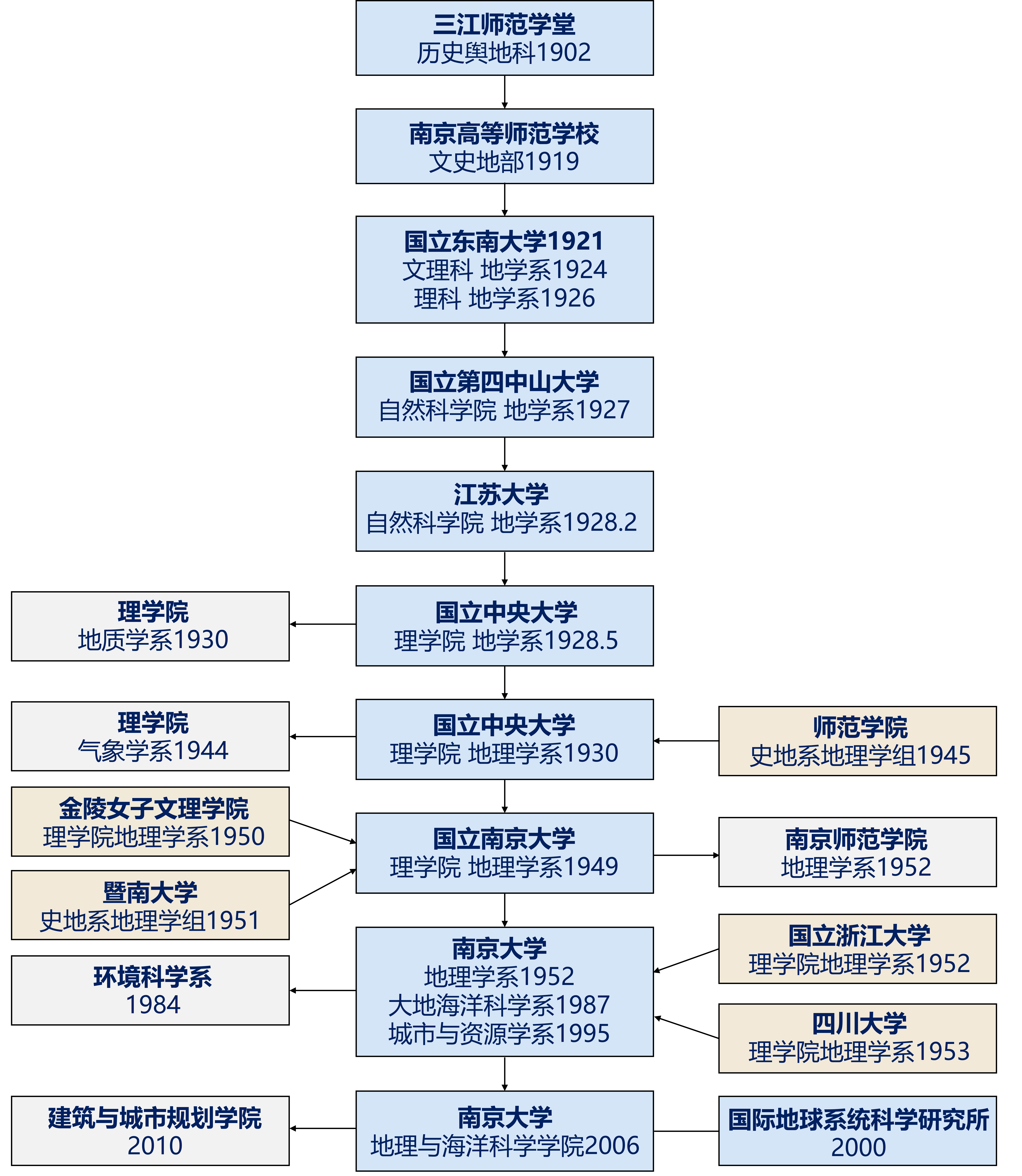 南京大学地理学科办学历史源远流长。1902年三江师范学堂设立历史舆地科,1919年南京高等师范学校设立文史地部。南京大学地理学科历史沿革如图所示。