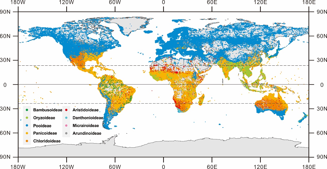 最近,在国际权威学术刊物《Earth-Science Reviews》上,发表了线上足球现金网 王翰林博士和鹿化煜教授的学术论文,他们研究和总结了全球各个大陆C4植被的扩张历史及其驱动机制,强调了气候要素的控制作用。这项研究首先建立了全球现代禾本科物种与气候对应关系数据集~1200万条,发现~10°C等温线是北美、东亚地区早熟禾亚科和黍亚科/虎尾草亚科分布的分界线,~400 mm等降水量线是北美、南非地区黍亚科和虎尾草亚科的分界线;同时发现各个大陆禾本科物种分布特征、气候适应区间有所不同,可能原因是区域气候,地形和本地物种等非生物和生物因素造成的。