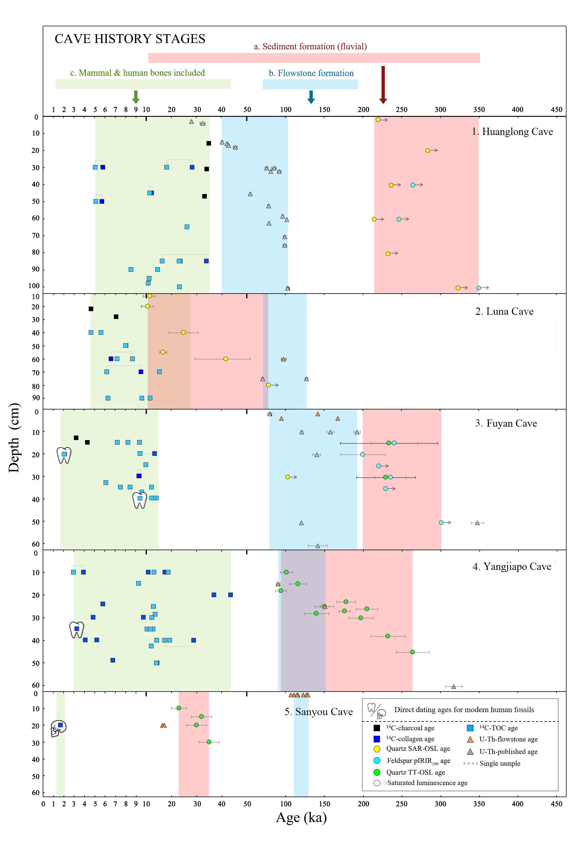 现金网-线上足球现金网 鹿化煜教授团队一直致力于地貌过程、气候变化与人类适应的研究,由团队成员孙雪峰副教授领衔的这项研究,基于多年积累,将地层年代学与现代人地理环境适应研究相结合,持续对我国南方5个与现代人起源相关的遗址——黄龙洞、陆那洞、福岩洞、杨家坡洞和三游洞(图1)进行了研究,他们完成了详细的地貌地层调查和多技术综合定年,包括不同技术的释光(SAR-OSL、TT-OSL、pIRIR)手段测定洞穴松散堆积物年代、铀(U)系方法测定钙板年代、加速器质谱放射性碳(AMS 14C)测定哺乳动物化石和人类化石年代等,并与复旦大学李辉教授团队合作,对现代人化石进行了古DNA分析。