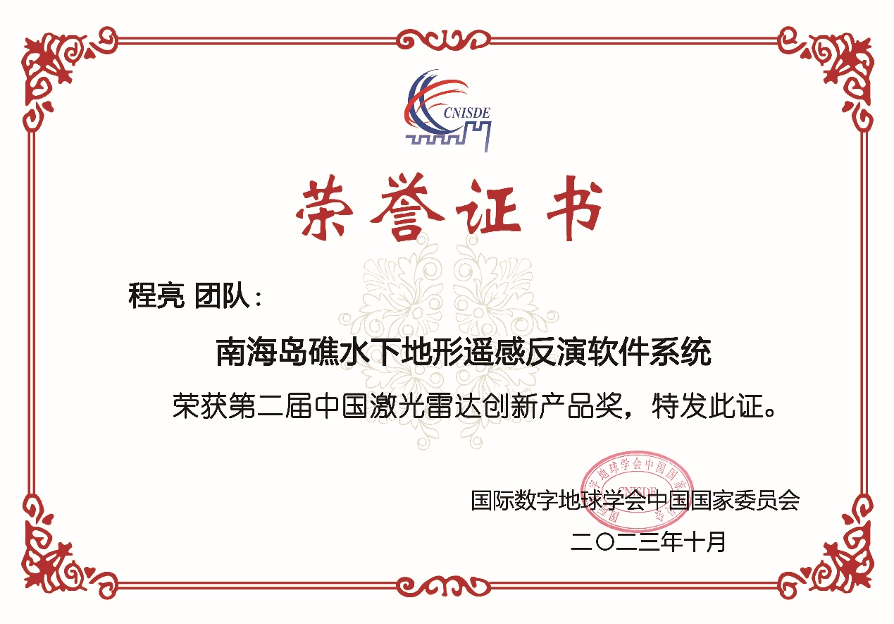 2023年10月20-22日,第七届全国激光雷达大会在河南理工大学成功举办,线上足球现金网 程亮教授团队研制的“南海岛礁水下地形遥感反演软件系统”获中国激光雷达创新产品奖(共5项),楚森森博士获中国激光雷达青年科学家提名奖。