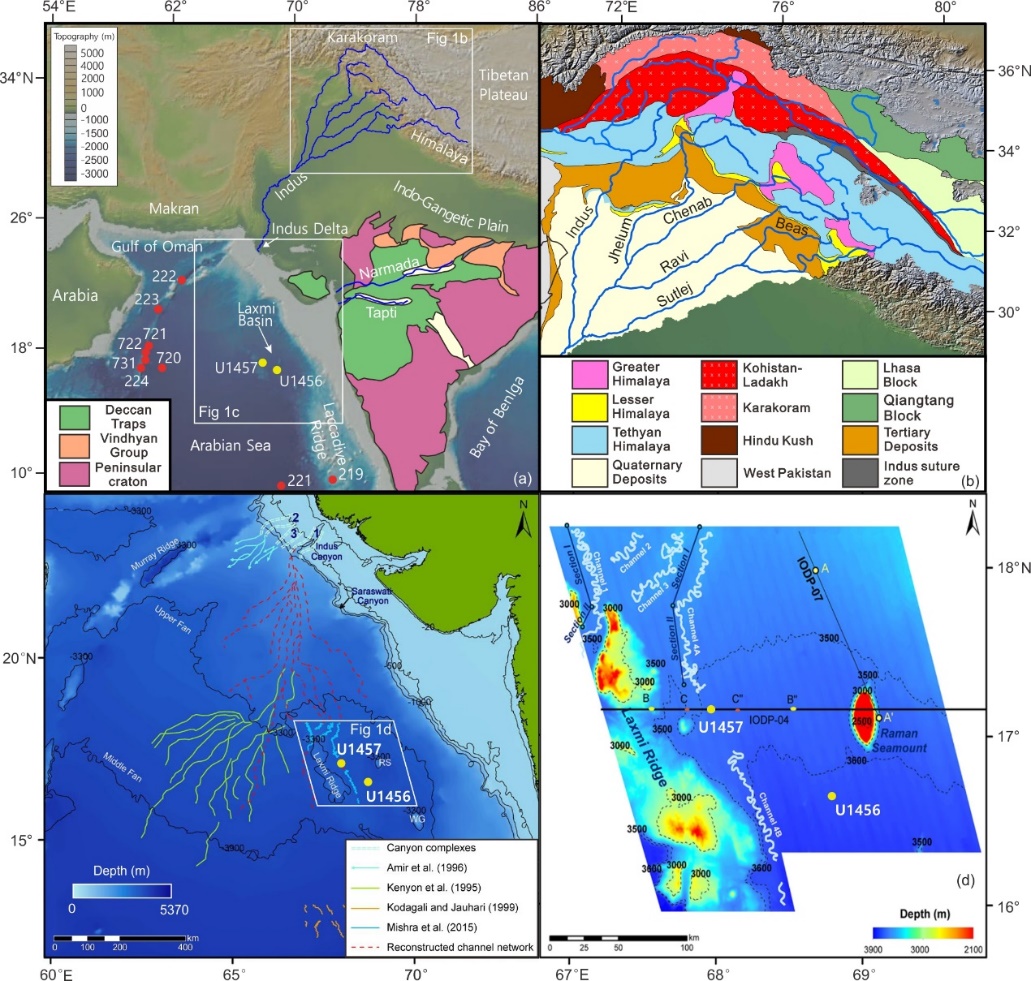青藏高原的形成和演化,对亚洲环境演变产生了重要影响。课题组围绕青藏高原南部阿拉伯海和北部渭河盆地的沉积记录(图1和图2),开展了青藏高原地貌效应与环境演变的研究。在高原隆升过程中,产生了大量地表侵蚀物质,在阿拉伯海和包括渭河盆地在内的邻区盆地沉积,这些沉积序列记录了青藏高原对亚洲环境演变的影响。基于此思路,课题组开展了地貌、沉积、年代、环境和气候动力的系统研究。锆石U-Pb年龄谱和Sr/Nd同位素显示,在高原南部,自渐新世 (~30 Ma)开始,喜马拉雅-喀喇昆仑山系的地表侵蚀物质,在阿拉伯海堆积,表明相应的地貌和流域格局已经形成。南亚季风降水在古印度河汇聚,传输沉积物到阿拉伯海(图1 )。高分辨率的阿拉伯海粒度和赤铁矿含量时间序列,揭示了环境演变的轨道周期(~100 ka、~40 ka和~20 ka)。同样,在青藏高原北部的渭河盆地(图2),渐新世白鹿塬组为厚层浅湖-滨湖相交替沉积,磷灰石裂变径迹年龄和高密度的古地磁定年,结合Lantianius xiehuensis、Sianodon bahoensis、Palaeolaginae indet.等哺乳动物化石组合,厘定了白鹿塬组于~30 Ma开始堆积,指示了流水纵横、湖面升降的干湿变化过程。沉积序列碳酸盐(次生方解石为主)不断加积,指示了渭河流域季节性干湿变化。渭河盆地苌沟剖面沉积序列高分辨率的古地磁和粒度研究,发现青藏高原北部上新世降水变化存在~100 ka、~40 ka和~20 ka的轨道周期,揭示了高纬和低纬驱动对渭河流域盆地汇水过程的影响。新的渭河盆地和阿拉伯海环境演变序列的同步研究(图1和图2),发现高原南部和北部的环境演变过程在构造和轨道时间尺度有密切联系,指示高原地貌隆升和太阳辐射在亚洲环境演变中的重要作用。这项成果从高原南部和北部同步研究青藏高原环境影响的新思路,揭示至少在渐新世初期,高原南部的地貌和气候环境格局初步形成;高原南部和北部在上新世环境的同周期变化,受到全球温度和海平面变化驱动。相关研究成果在国内外重要学术刊物发表 (Feng et al., 2021, Geology; Lyu et al., 2021, Science China Earth Sciences; Wang et al., 2020, Science Advances; Lu et al., 2020, Geological Magazine.),受到同行专家的肯定。