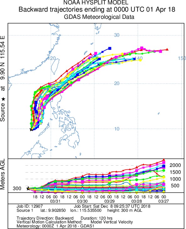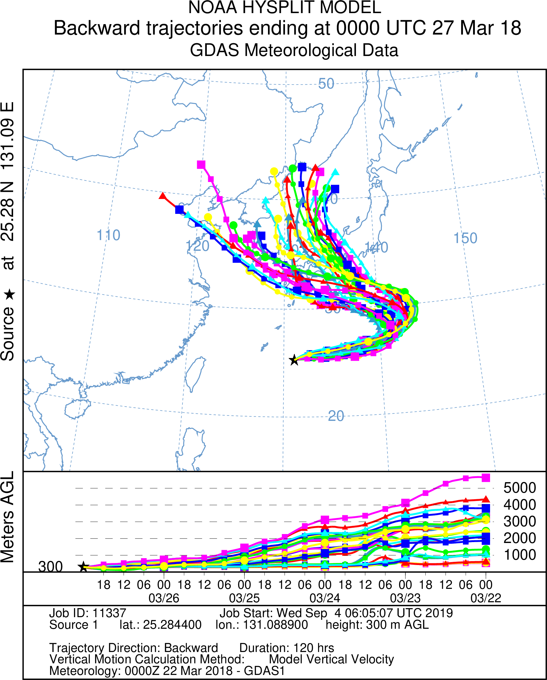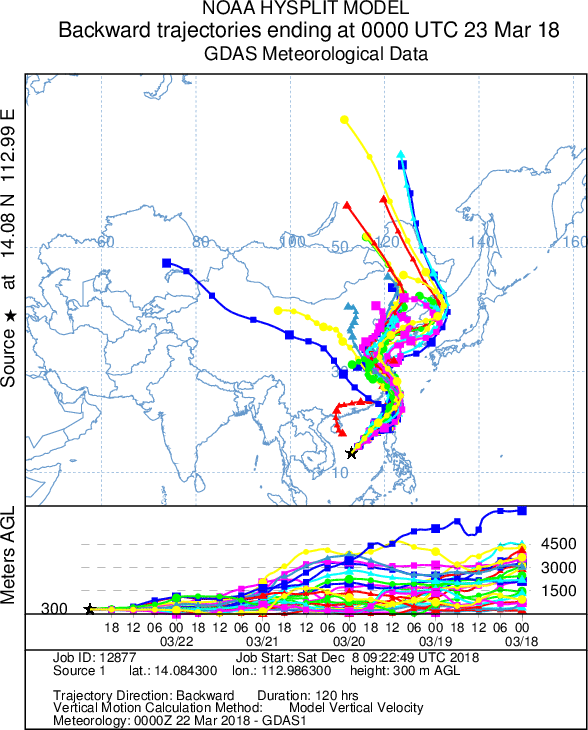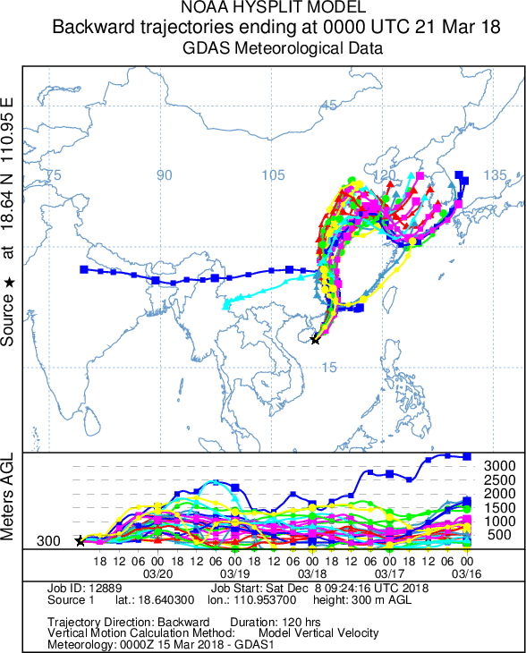 本研究对南海珊瑚礁海域PAHs在大气和水体中的分布、来源以及迁移趋势进行研究讨论,得出以下结论:(1)春季南海表层水体PAHs含量为8.0 ± 5.5 ng/L,高值主要受到船舶通航密度影响;(2)气相PAHs含量为41.3 ± 24.7 ng/m3,高值区主要在南沙海域,可能受到菲律宾等周边国家的排放影响(图1);(3)利用HYSPLIT模型对研究区气团120h运行轨迹进行模拟,发现在东亚季风的影响下,气相PAHs的主要来源为中国大陆的东北部和朝鲜半岛区域的远距离输送(图2);(4)水气交换的结果显示整个研究区在春季都呈现出显著的由气向海输运的趋势,通量为-36.70 ± 23.7 ng/m2/d;(5)通过对PAHs在气相和颗粒相的分配系数的计算得出PAHs主要被吸附于颗粒物中。低的悬浮颗粒物浓度和持续的陆源输入表明此时气-粒分配系统尚未达到平衡状态。该研究对珊瑚礁海域的PAHs的污染状态及来源提供了数据支撑,并对珊瑚礁海区的污染管控提供更具体的信息。