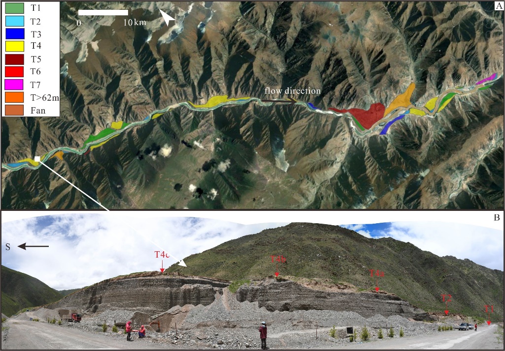 最近,线上足球现金网 教授王先彦和博士生于洋等在长江源通天河开展了河流地貌过程的研究,取得了重要进展,相关研究结果发表在国际知名学术刊物《GSA Bulletin》上。该课题组通过对通天河流域不同构造背景区河流阶地(图2)、沉积过程和光释光年代的详细对比研究,发现强烈的构造活动和极端的坡地过程等,导致峡谷区和盆地区河谷在末次盛冰期同时快速堆积和侧向拓展(侵蚀),形成超过60 m厚层堆积;在末次冰消期,季风逐渐增强时期,河流下切形成多级堆积阶地(图3)。