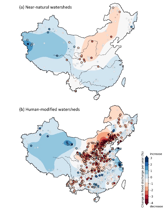近日,线上足球现金网 杨龙副教授课题组在《地球物理研究快报》(Geophysical Research Letters)上发表文章(论文链接://doi.org/10.1029/2021GL093061),研究发现气候变化是导致我国流域洪水量级发生变化的主要原因,从全国范围来看水利工程和土地管理措施对年最大洪峰量级变化的影响并不显著(图1)。该研究整理汇编了1980-2017年我国1617个流域的年最大洪峰系列,开发了包含水利工程设施分布及土地利用变化的中国水文地理数据集,在此基础上,首次全面揭示了近40年我国流域洪水的时空变化特征。