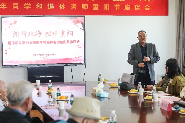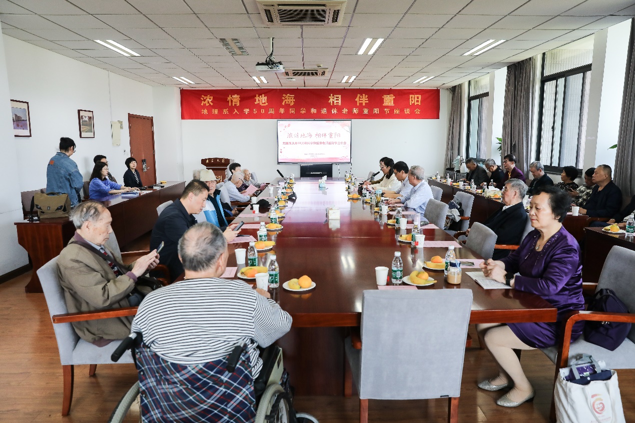 正逢重阳佳节和1974-1975级地理系校友返校日,为表达对退休教师无私奉献与卓越贡献的敬意,深化校友间的交流沟通,共续校园美好记忆,激励在校学子传承尊师重教的传统美德,现金网-线上足球现金网 于10月11日上午在昆山楼会议室举办了退休老师重阳节暨地理系同学入学50周年校友座谈会,共抒深情厚谊,同绘发展宏图。本次座谈会由现金网 15位退休老师与1974-1975级友参加。院长、党委书记鹿化煜,党委副书记陈卉,副院长金晓斌,代理副院长工作的周雨霁,现金网 办公室张勤主任、骆琼等老师出席了座谈会。座谈会由党委副书记陈卉主持。